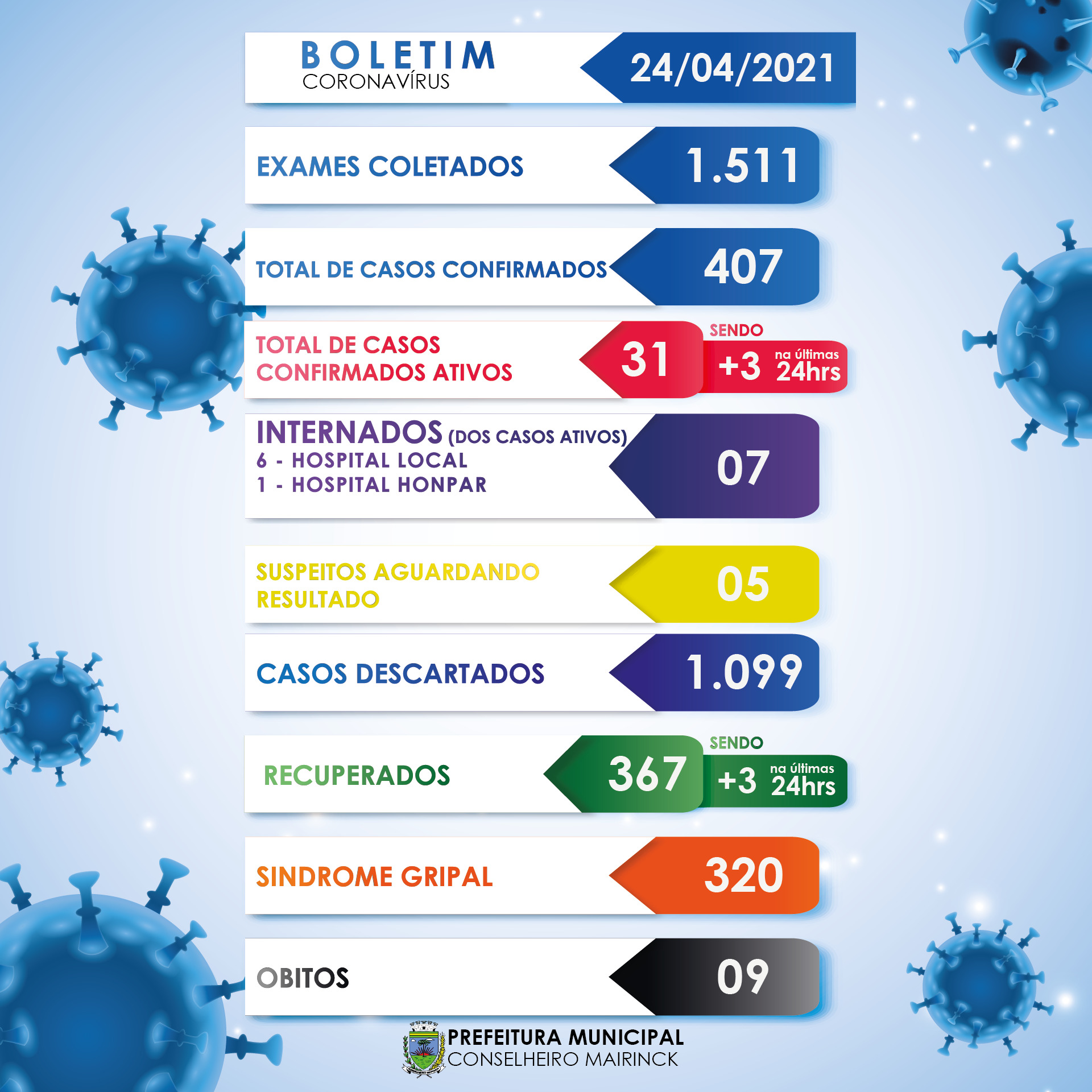A SECRETARIA MUNICIPAL DE SAÚDE DE CONSELHEIRO MAIRINCK COMUNICA QUE ATÉ O PRESENTE MOMENTO 29/04/2021 FORAM RECEBIDAS E MINISTRADAS AS SEGUINTES DOSES DE VACINAS CONTRA A COVID-19: