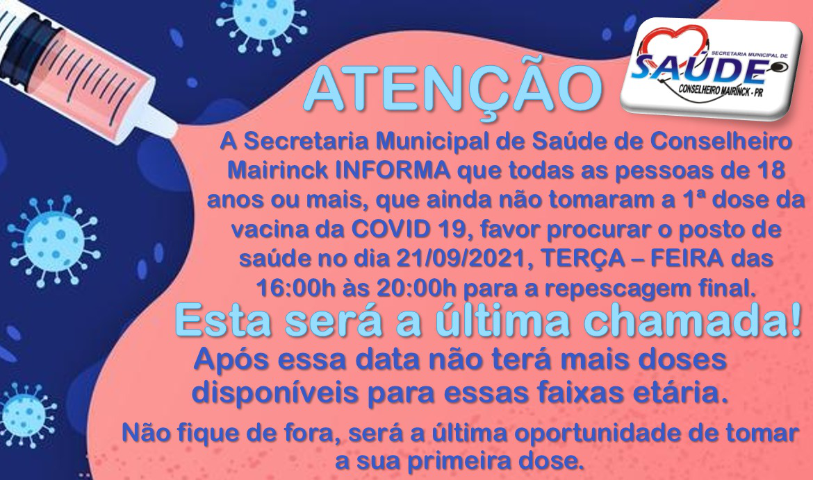 A Secretaria Municipal de Saúde de Conselheiro Mairinck informa que estará realizando a vacina em pessoas de 17 anos.