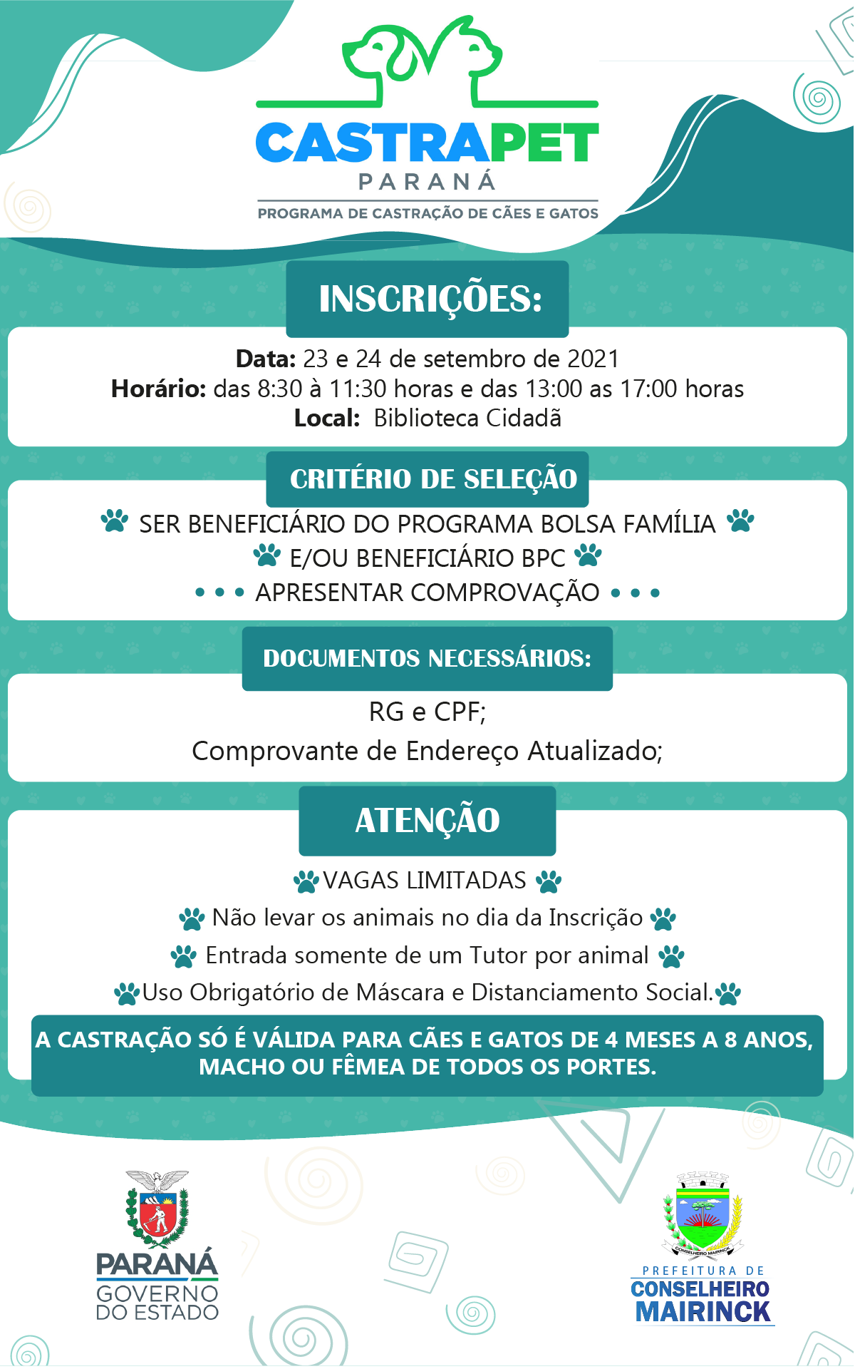 A Prefeitura de Conselheiro Mairinck está no Programa Permanente de Esterilização de Cães e Gatos (Castrapet Paraná), em parceria com a Secretaria de Estado do Desenvolvimento Sustentável e do Turismo (Sedest...